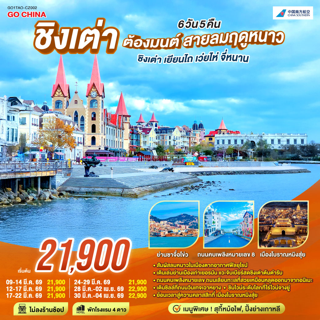 GO1TAO-CZ002 | ชิงเต่า ต้องมนต์ สายลมฤดูหนาว ชิงเต่า เยียนไถ เว่ยไห่ จี่หนาน 6 วัน 5 คืน โดยสายการบิน ไชน่า เซาเทิร์น (CZ) |