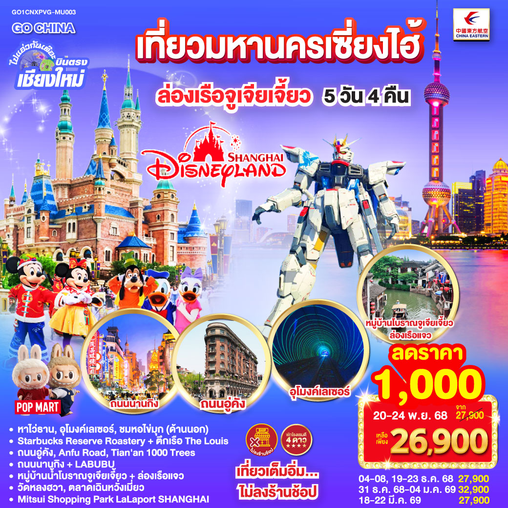GO1CNXPVG-MU003 | บินตรงเชียงใหม่.. เที่ยวมหานครเซี่ยงไฮ้ ล่องเรือจูเจียเจี้ยว Disneyland 5 วัน 4 คืน **พักดี 4 ดาว..เที่ยวเต็มอิ่ม..ไม่ลงร้านช้อป**โดยสายการบิน China Eastern (MU) |
