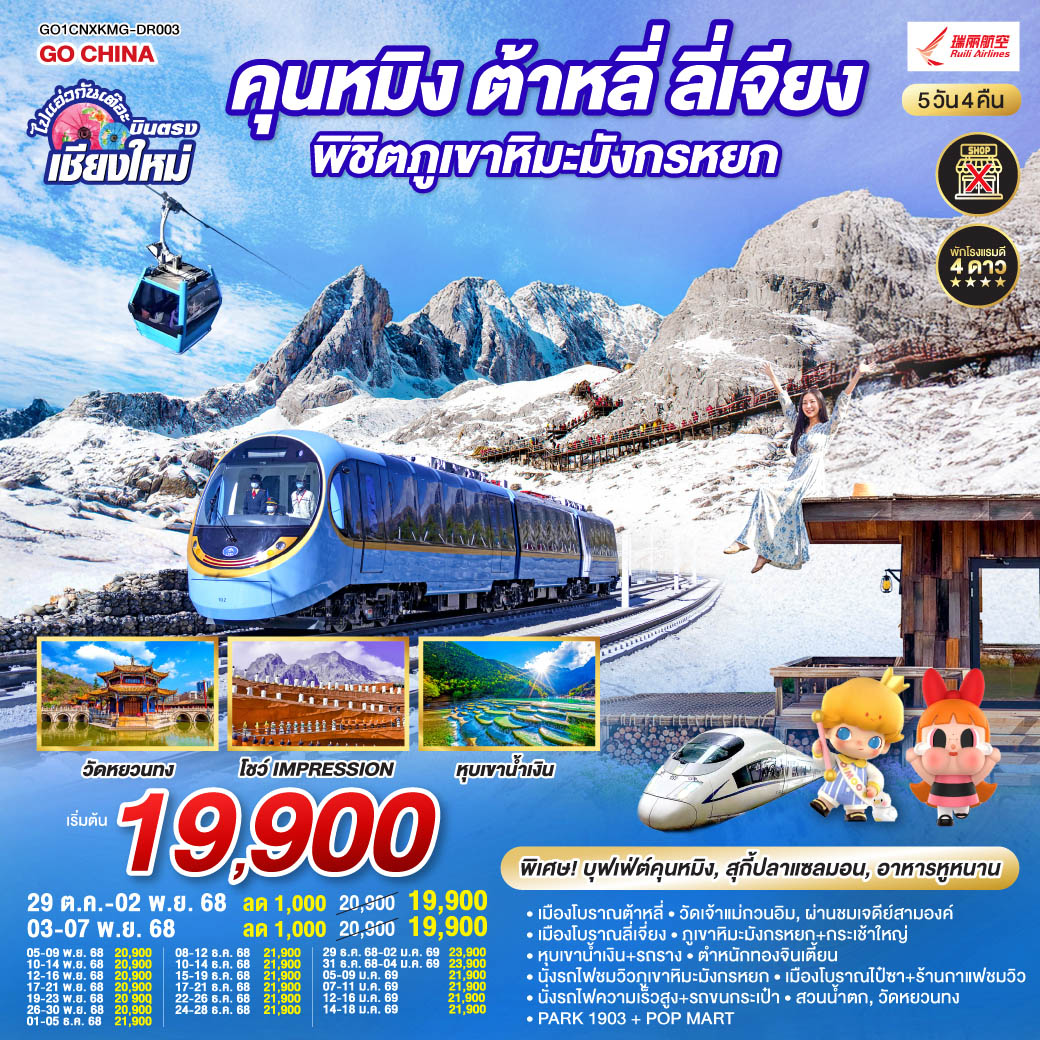 บินตรงเชียงใหม่ คุนหมิง ต้าหลี่ ลี่เจียง ภูเขาหิมะมังกรหยก 5 วัน 4 คืน นั่งรถไฟความเร็วสูง 1 เที่ยว + นั่งรถไฟชมวิว โดยสายการบิน Ruili Airlines (DR) ** เที่ยวเต็มอิ่ม..ไม่ลงร้านช้อป**