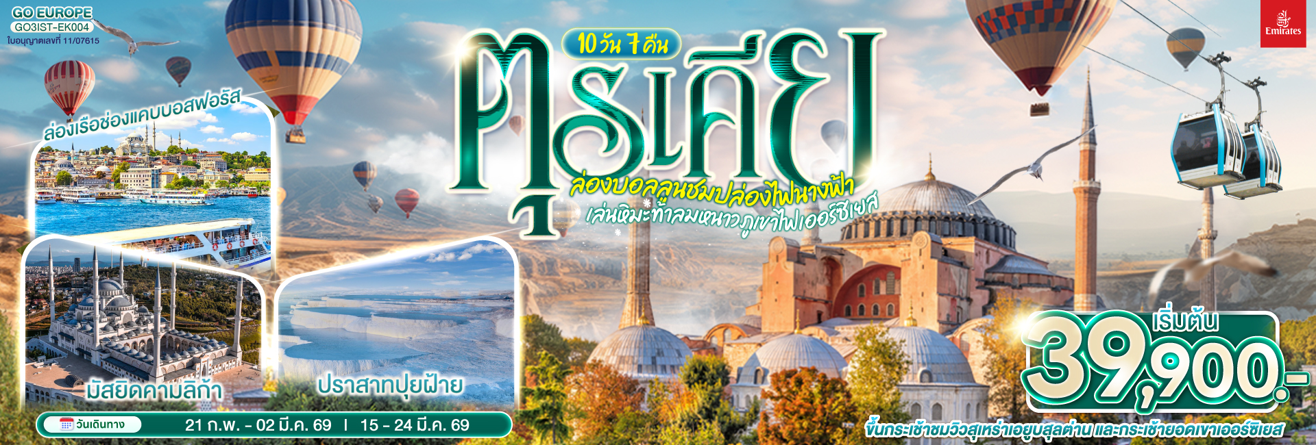 ตุรเคีย ล่องบอลลูนชมปล่องไฟนางฟ้า เล่นหิมะท้าลมหนาวภูเขาไฟเออร์ซิเยส 10 วัน 7 คืน พักโรงแรมสไตล์ถ้ำ 1 คืน โดยสายการบินเอมิเรตส์ (EK)