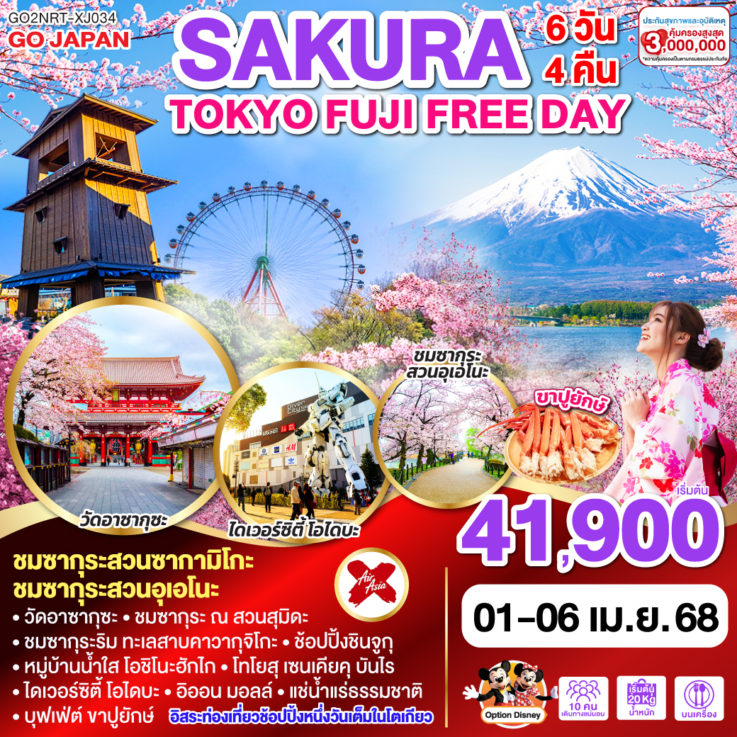 | 2 | โตเกียว (สนามบินนาริตะ) – วัดอาซากุซะ – ช้อปปิ้งนากามิเสะ – ชมซากุระ ณ สวนสุมิดะ – ถ่ายรูปวิวโตเกียวสกายทรีริมแม่น้ำสุมิดะ – ชมซากุระ สวนซากามิโกะ – แช่น้ำแร่ธรรมชาติ – บุฟเฟ่ต์ ขาปูยักษ์ | ✘ | ✔ | ✔ | KAWAGUCHIKO ONSEN HOTEL หรือเทียบเท่าระดับ 3 ดาว [♨] (ที่นอนอาจเป็นแบบ เบาะฟุตง หรือ เตียง ขึ้นอยู่กับการจัดการของทางโรงแรม) หลังอาหารค่ำผ่อนคลายกับการแช่น้ำจากแร่ธรรมชาติสไตล์ญี่ปุ่น |