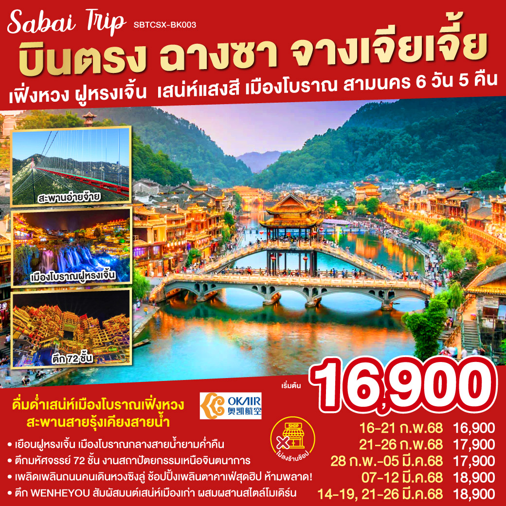 | 2 | ฉางซา - ฉางเต๋อ - วัดเชียนหมิง – เมืองโบราณเฟิ่งหวง - สะพานสายรุ้ง - ถนนคนเดินสือป้าน – เมืองเฟิ่งหวง | ✔ | ✔ | ✔ | FENGHUANG GUOBIN HOTEL หรือเทียบเท่าระดับ 4 ดาว (มาตรฐานประเทศจีน) |